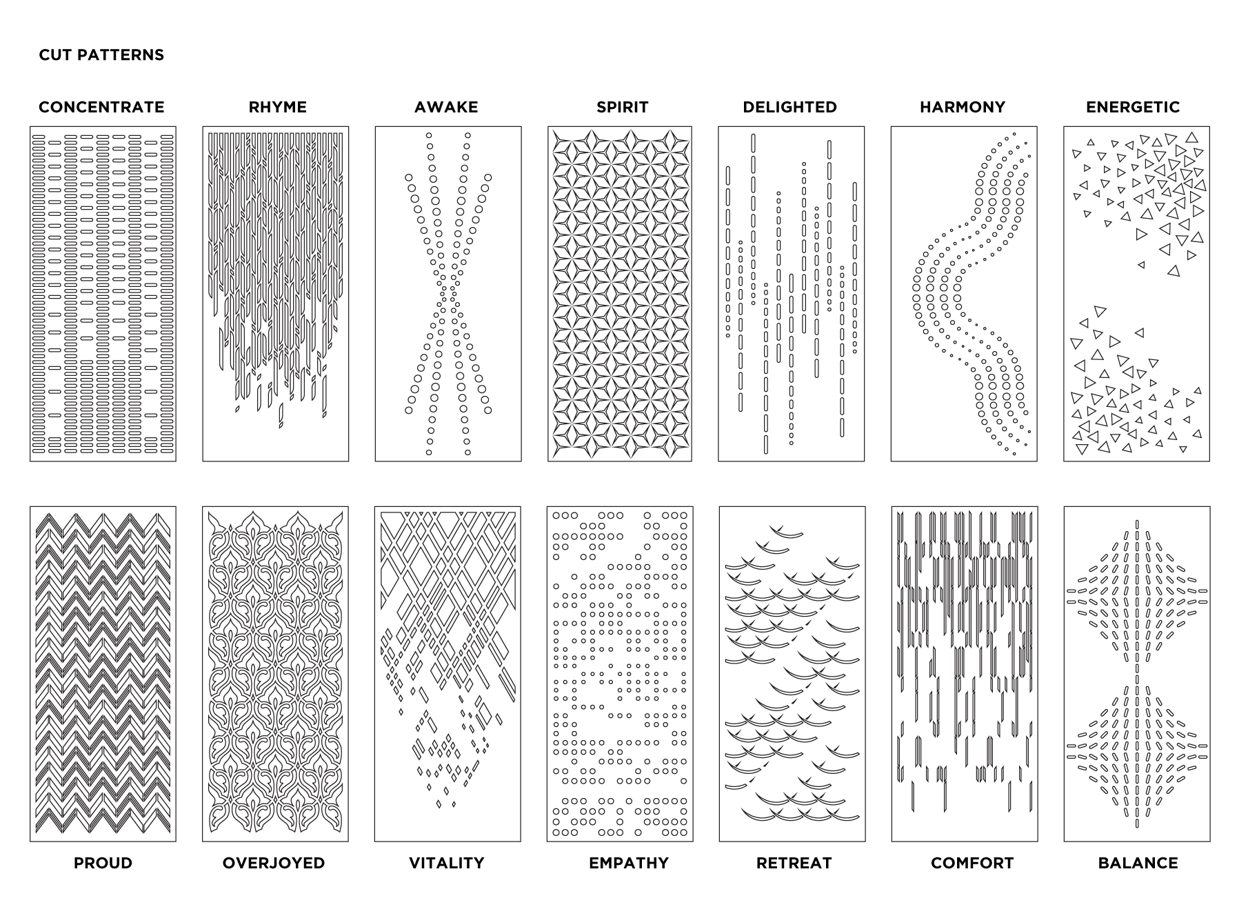 Duet is a sound absorbent panel for interior wall or ceiling or partition applications in a variety of facility types such as schools, theatres, convention centers, office buildings, hotels, government, music rooms and residential.